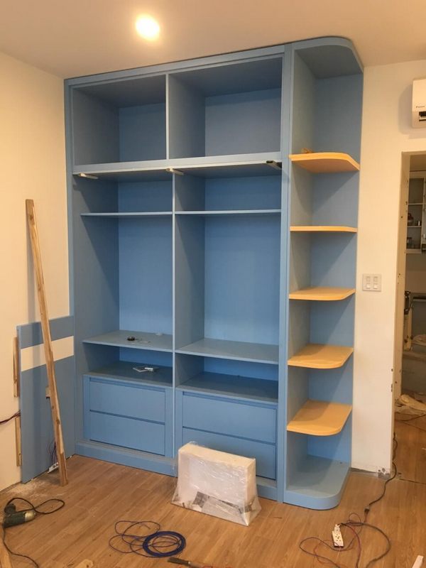 Hình ảnh đang lắp đặt, phòng ngủ trẻ con chung cư Thăng Long No1 tủ áo gỗ công nghiệp sơn màu xanh kết hợp với kệ bên hông hiện đại