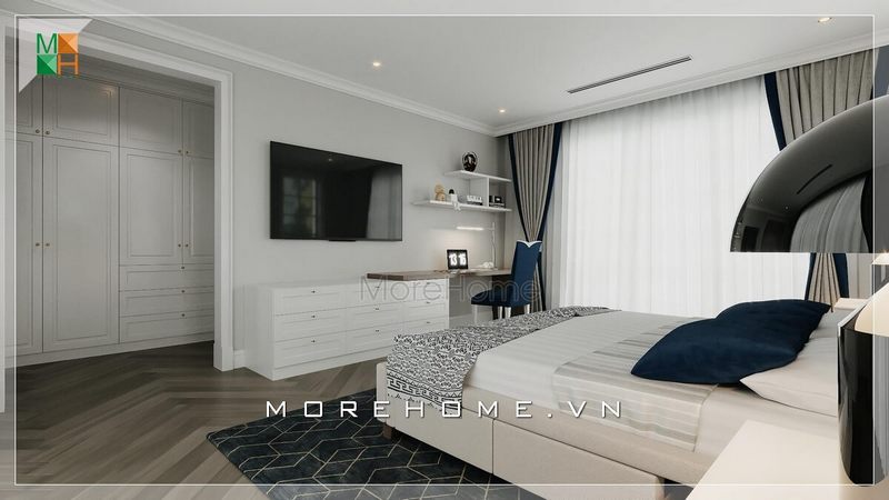 Hệ thống tủ quần áo âm tường hiện đại được bố trí thông với không gian phòng ngủ nhưng bạn vẫn cảm nhận thấy sự thoáng đãng, tinh tế đầy ấn tượng.
